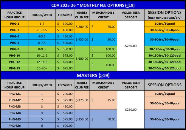 CLICK HERE to see the cost and hour options offered at each team level. Once discussed with the coach and approved, the diver's actual modified schedule will be reviewed & approved by the Administrator.